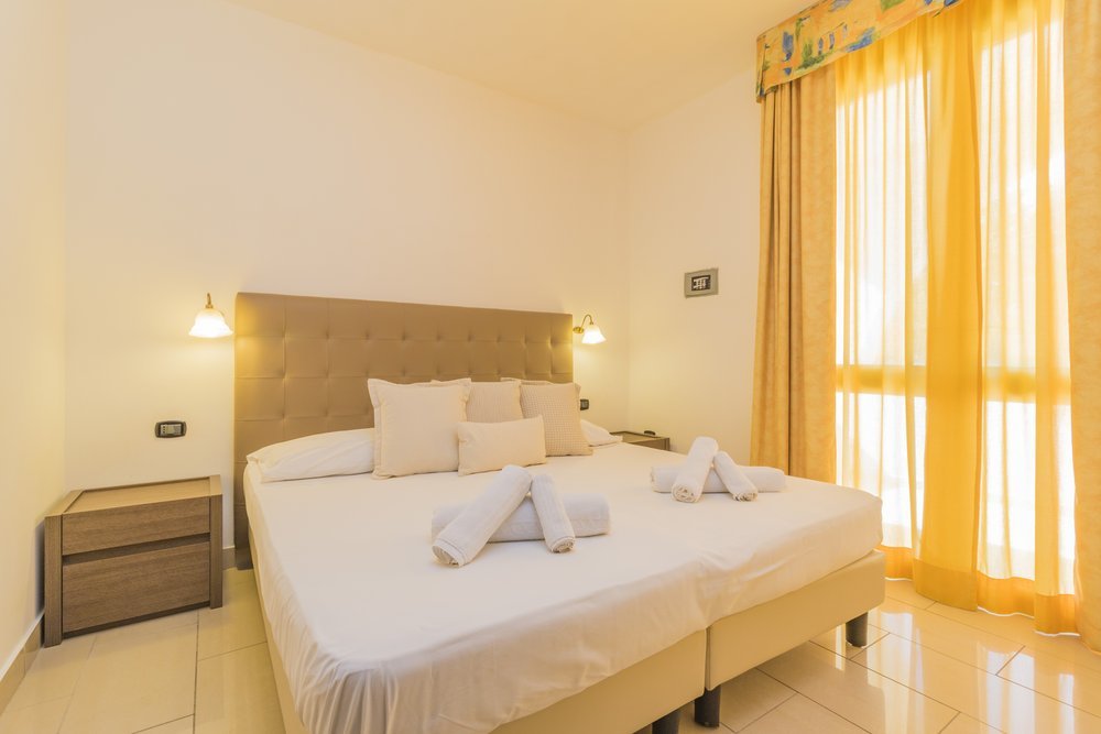 Sistemazione: Le camere, elegantemente arredate in stile tipico, situate al piano terra, promo o secondo piano, sono tutte dotate di veranda o balcone, aria condizionata, tv satellitare , telefono, cassetta di sicurezza, frigobar, servizi con box doccia e asciugacapelli. Junior Suite per 2/4 persone composte da camera matrimoniale, zona giorno con dormeuse, eventuale 2° dormeuse in camera matrimoniale; Comfort per 2 persone, tutte al piano terra; Junior Suite Duplex per 3/4 persone, su 2 piani, 1° piano zona giorno con doppia dormeuse e bagno, 2° piano con camera matrimoniale bagno; Family per 3/5 persone, con arredi più semplici, composte da camera matrimoniale, camera con 2 letti singoli e dormeuse in zona giorno. Possibilità di camere Comfort per diversamente abili.