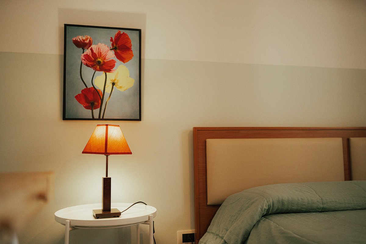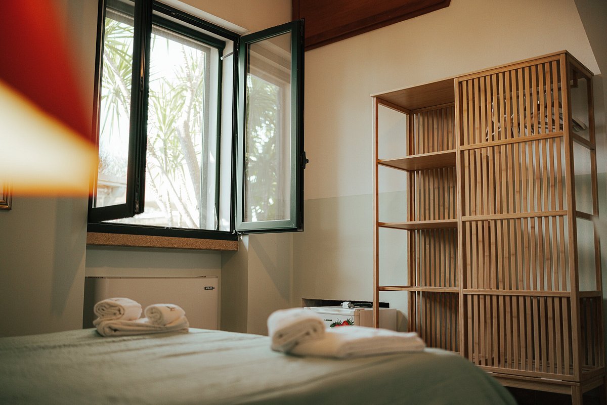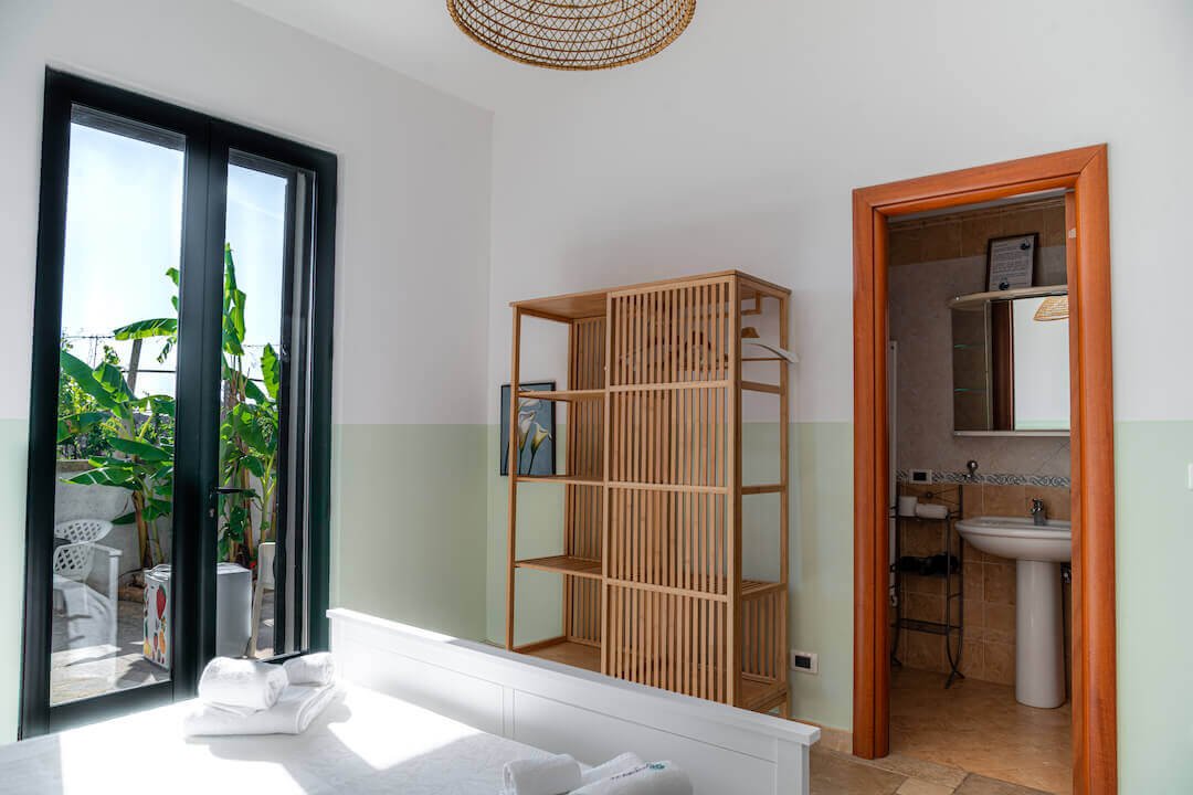 Camera Family: Questa tipologia di camera comprende: ingresso unico in camera quadrupla con letto matrimoniale e letto a castello, bagno con doccia, corridoio che comunica con la camera doppia con letto matrimoniale con bagno con doccia. Dotate di aria condizionata, riscaldamento, tv schermo piatto in ogni stanza, frigo, zanzariere, asciugacapelli e set cortesia a base di olio extra vergine di oliva.