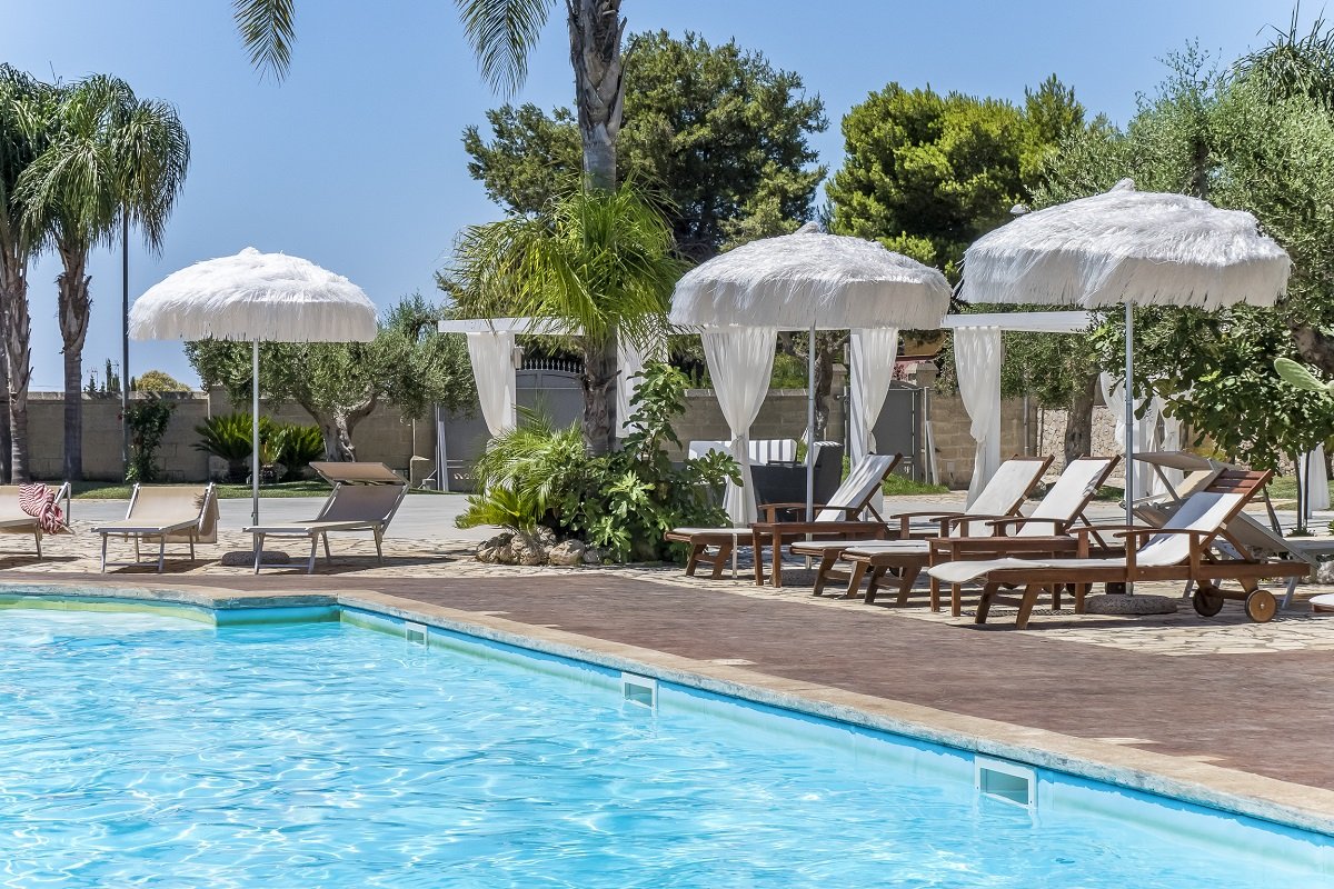 2 ampie piscine moderne, di cui una con vasca idromassaggio, attrezzate con lettini, ombrelloni e gazebi, adiacenti al bar piscina, dove gustare ottimi aperitivi e piatti freddi.