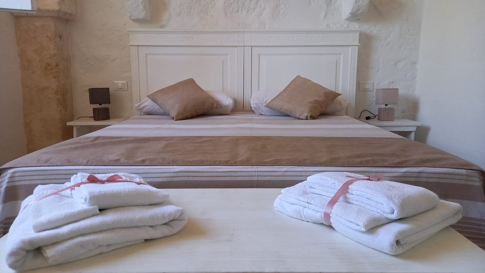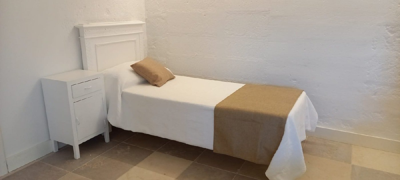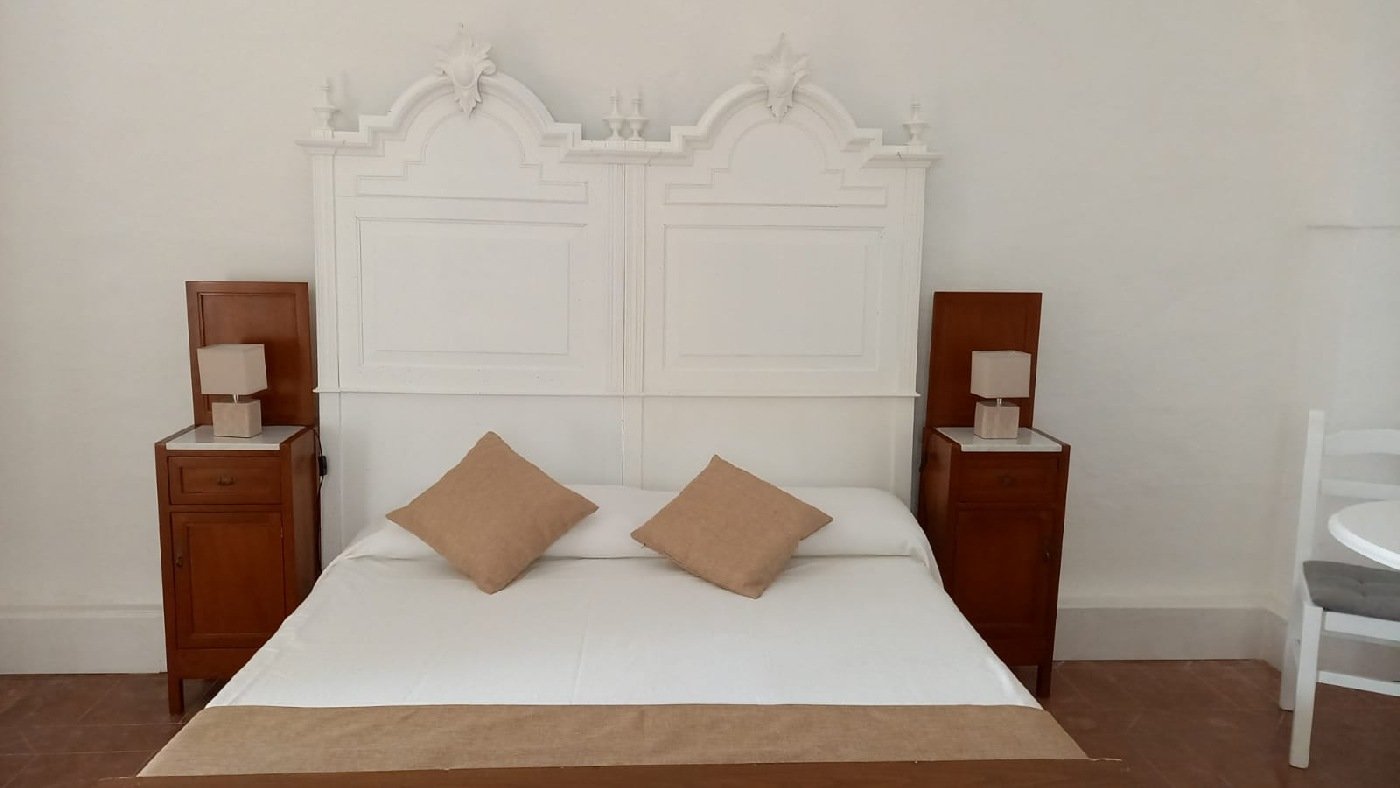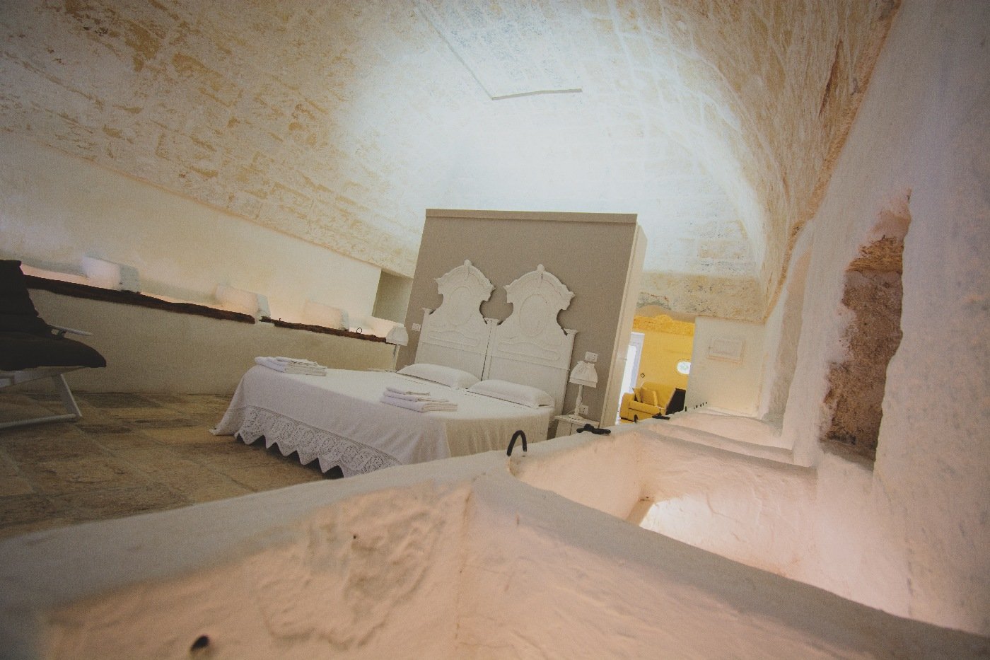 Ampia camera con WC, camino, terrazza panoramica vista mare al primo piano. Letto matrimoniale, possibilità terzo letto. La camera, le pareti, il camino, gli arredi sono legati alla tradizione delle masserie del Salento. Fino a 2+1 persone.