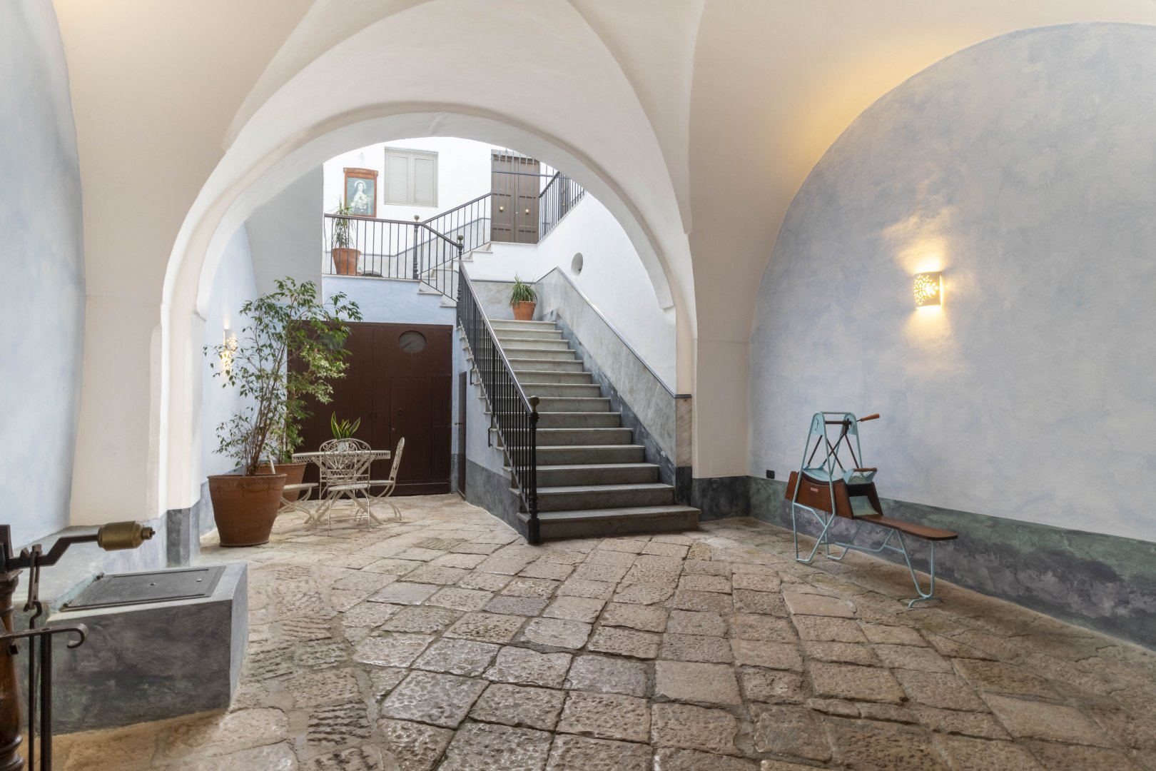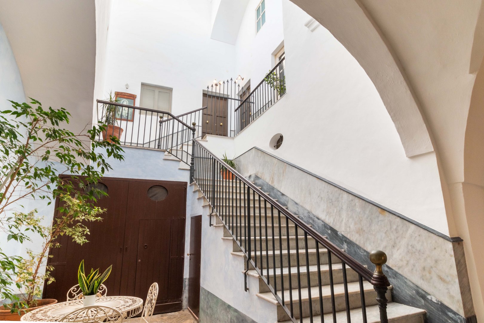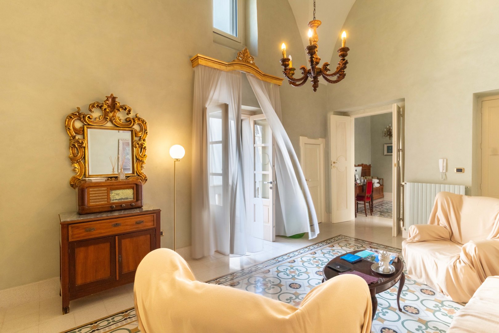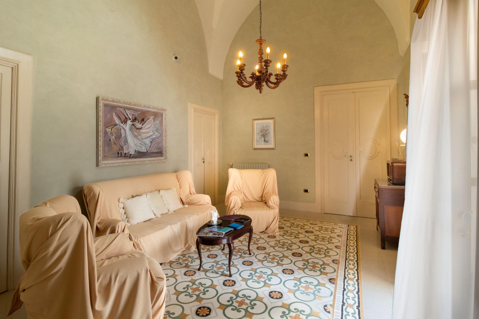 Con il candore delle volte a stella che cedono il passo ai toni delicati e caldi delle pareti, la camera tripla è l’ambiente ideale per accogliere una famiglia o tre ospiti che vogliano rifugiarsi in un luogo luminoso, ampio e capace di infondere tutta la tranquillità di un Palazzo signorile. Sin d in dal vostro ingresso, non potrete far a meno di ammirare la raffinatezza degli arredi in stile liberty, che combinano a materiali quali il legno e il ferro battuto le loro linee sinuose ma essenziali. A meravigliare lo sguardo sono anche gli antichi pavimenti con le loro geometrie dalle tinte tenui e polverose, che accompagnano il passo alla scoperta dei due ambienti che compongono la camera, il primo con letto matrimoniale e il secondo pensato per un terzo ospite. L’affaccio sul giardino interno garantisce agli spazi una luce piena e ristoratrice. Leggi tutto »...