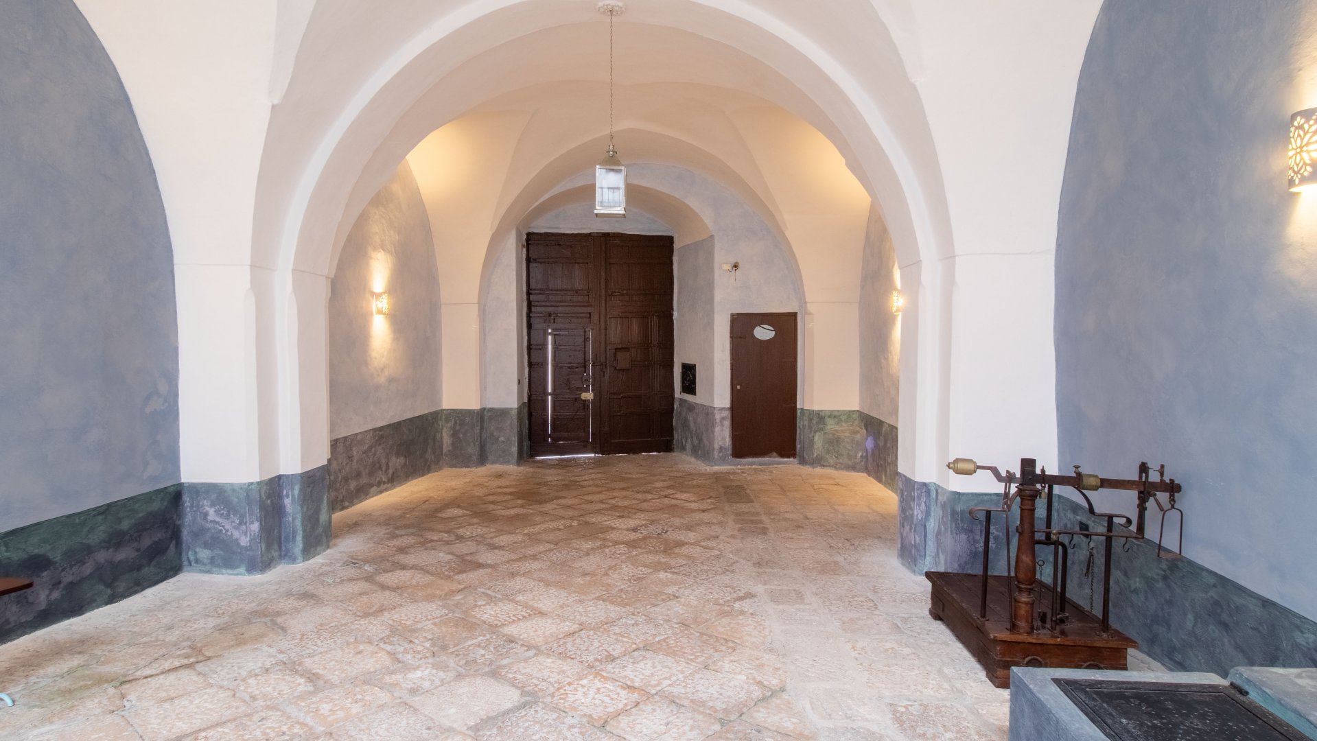 La camera, completa di ogni confort, è abbracciata dalle alte volte a stella, la cui imponenza non rinuncia alla dolce raffinatezza che è la cifra stilistica dell’intero ambiente. A decorare i suoi peculiari soffitti, infatti, sono affreschi che alternano al bianco le sfumature più tenui del verde e richiami floreali dalle linee sinuose e morbide, che si ritrovano negli arredi originali d’epoca in stile liberty. Le linee del letto matrimoniale in ferro battuto aggiungono morbidezza alle colorate geometrie del pavimento d’epoca, che omaggia i colori del mare e che fa da specchio alla luce mite e calda di questa stanza.