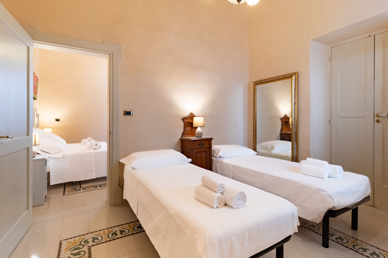 Sin dal vostro ingresso, non potrete far a meno di ammirare la raffinatezza degli arredi in stile liberty, che combinano a materiali quali il legno e il ferro battuto le loro linee sinuose ma essenziali. A meravigliare lo sguardo sono anche gli antichi pavimenti con le loro geometrie dalle tinte tenui e polverose, che accompagnano il passo alla scoperta dei due ambienti che compongono la camera, il primo con letto matrimoniale e il secondo pensato per un terzo ospite. L’affaccio sul giardino interno garantisce agli spazi una luce piena e ristoratrice.