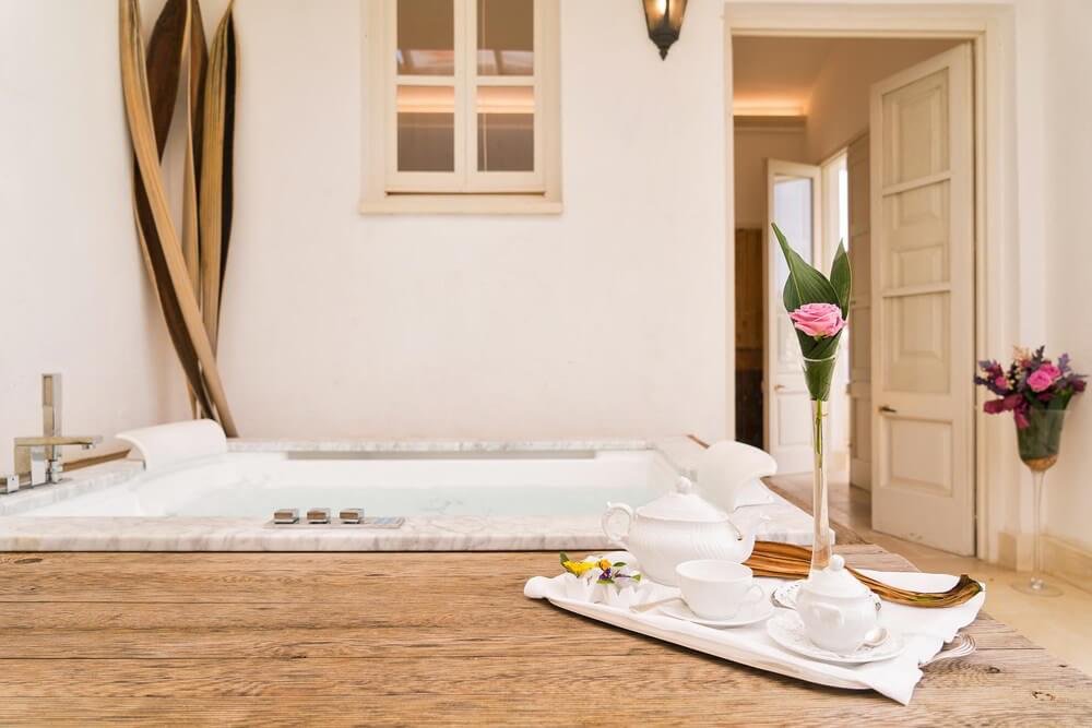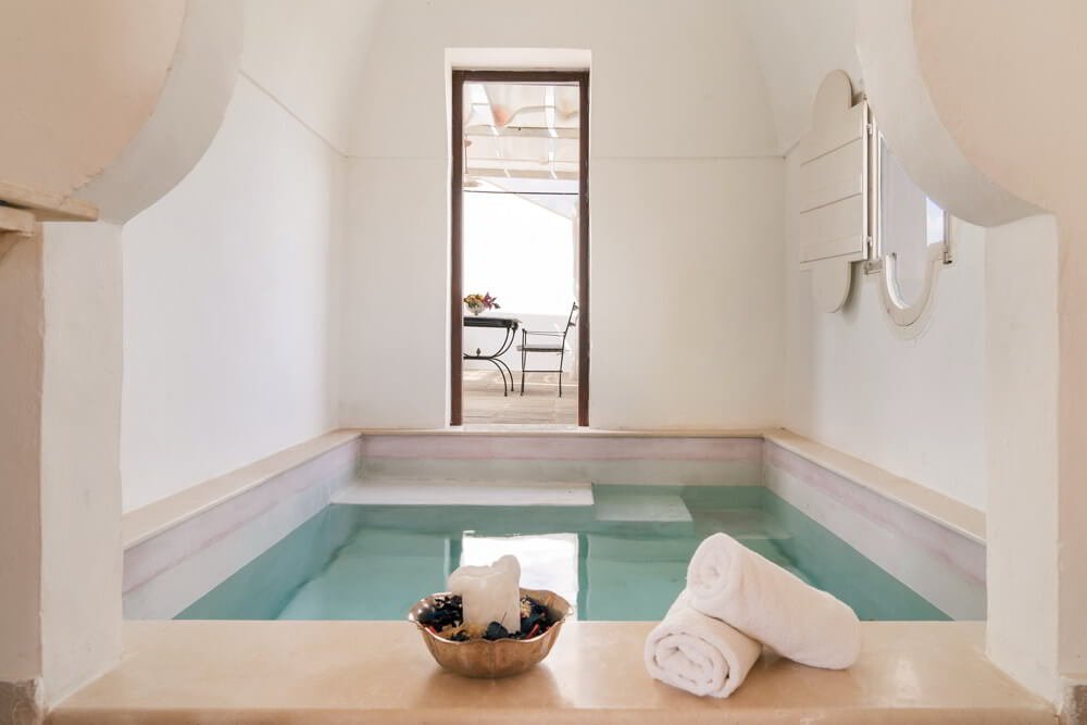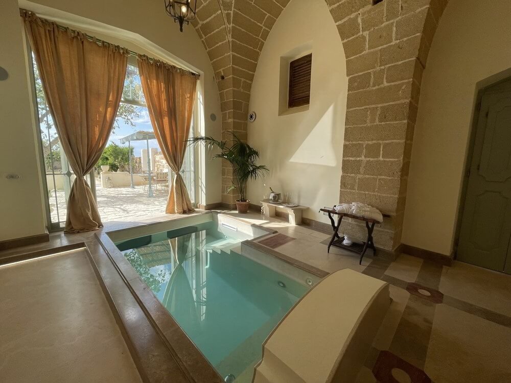 Questa camera incarna l’eleganza dello stile salentino: semplicità e tradizione nei colori, un antico soffitto a volta in carparo e un’intera parete sostituita da una maestosa porta-finestra in vetro che oltre ad aprirsi sul terrazzo privato, offre un’ampia veduta sull’aranceto ottocentesco del cort del cortile interno. Letto matrimoniale king size, morbide lenzuola in lino e una piscina interna di 6 m2 dotata di riscaldamento e idromassaggio garantiscono un’atmosfera perfetta per rilassarsi. La temperatura della piscina nella camera non supera i 30°C. Leggi tutto »...