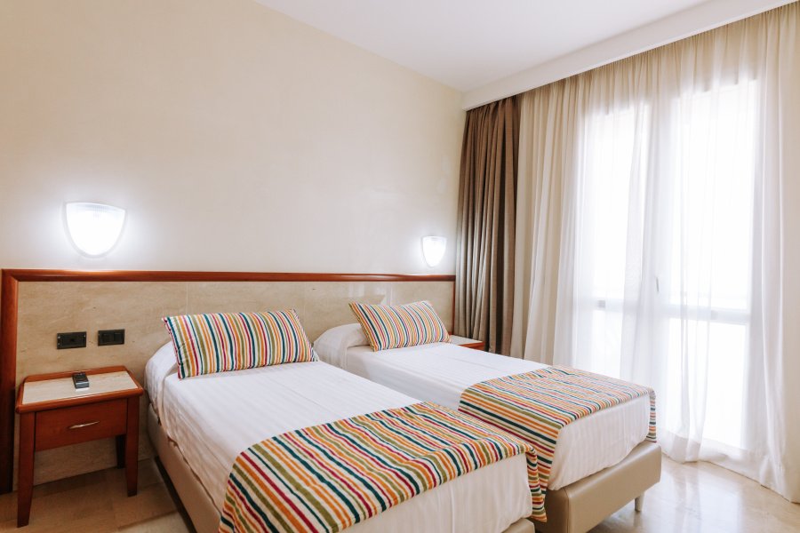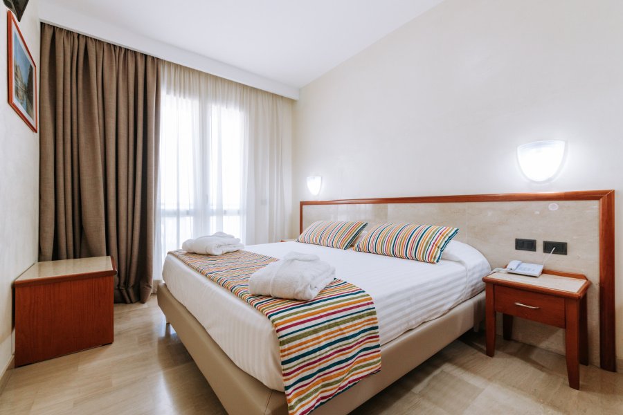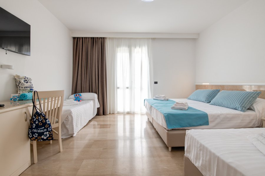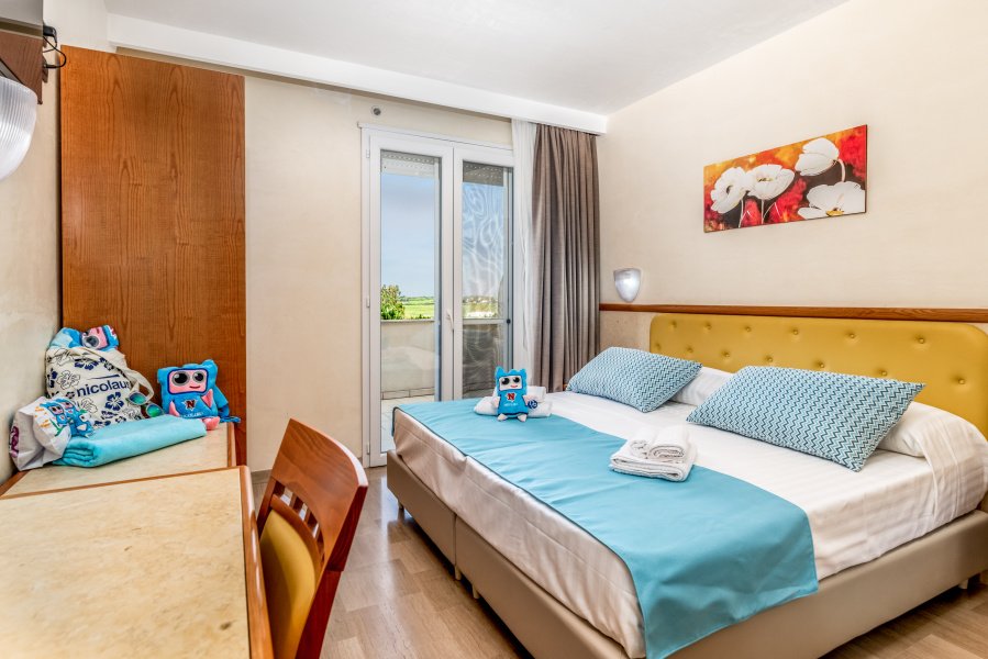 Le 135 camere dell Hotel, disposte su più piani, tutte dotate di balcone attrezzato, aria condizionata, TV LCD, minibar (consumazioni a pagamento, fornitura gratuita di 2 bottigliette di acqua all'arrivo), cassetta di sicurezza, telefono, servizi con doccia e asciugacapelli. Si suddividono in: Classic, fino a 4 posti letto con 3° e 4° singolo, possibilità di camere vista piscina ( con supplemento); Comfort, fino a 3 posti letto, dotate di arredi di categoria superiore e più ampie; Deluxe, dotate di doppia ambiente e composte da camera matrimoniale e camera doppia, ideali per nuclei familiari o gruppi di amici. Gli ospiti delle camere Deluxe avranno diritto alla couverture seral, set linea cortesia top, accappatoio e ciabattine, macchina per espresso con dotazione di cialde, prima fornitura analcolica minibar, fornitura giornaliera di 2 bottigliette di acqua, telo mare con cambio giornaliero e posto auto riservato nella zona ombreggiata. La struttura è priva di barriere architettoniche e dispone di camera matrimoniale, camera per persone con disabilità.
